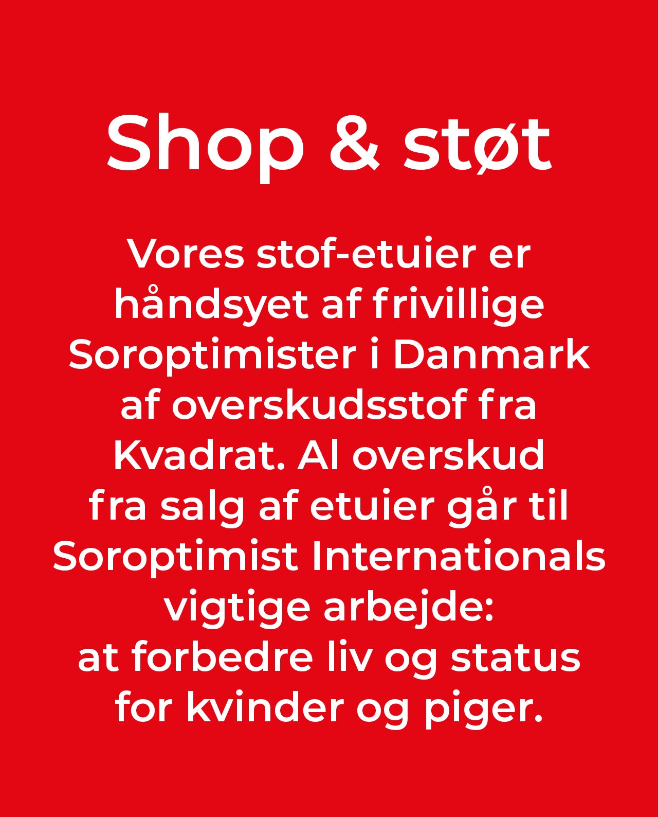 Vores unikke upcycled brilleetuier er syet af overskudsstof fra tekstilvirksomheden Kvadrat. Etuierne bliver syet af frivillige kvinder, der er medlemmer af Soroptimist International Kolding, Danmark. Soroptimist International er en verdensomspændende organisation, hvis formål er at forbedre liv og status for kvinder og piger, både lokalt, nationalt og internationalt. Al overskud fra salg af etuier går til Soroptimist International.